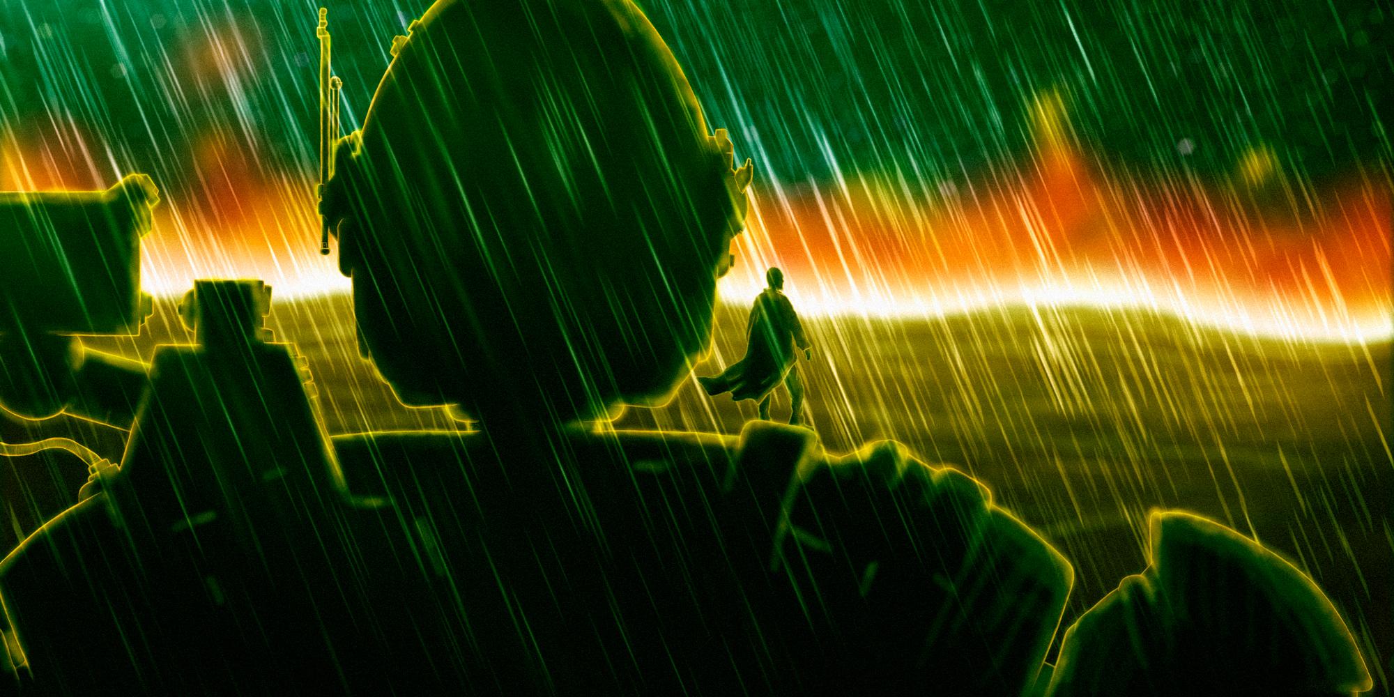 Vettä sataa kaatamalla. Istun pienen kiven päällä, joka lepää soraisella mäellä. Etäämmällä kymmenet tuhannet sotilaat taisteluhaarniskoissa juoksevat kohti liekehtivää horisonttia. Seuraan tätä mittavaa operaatiota haikeana. Maa alkaa tärisemään holtittomasti. Vierelleni juoksee pilvenpiirtäjän korkuinen taistelurobotti. Se ampuu kaikilla tykeillään horisonttiin ja kääntyy sitten katsomaan minua.