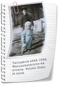 Minä synnyin 50-luvun puolivälissä ja olin usein sairaalassa 60-luvun alussa. Joku luu oli aina poikki ja vietin sairaalassa viikkoja. Meillä ei selvästi hävetty minun tai isäni vammaisuutta, mutta ei sitä myöskään tuotu esiin. Minusta ei ole yhtään valokuvaa sairaala-ajoilta, vaikka ne olivat minulle merkittäviä ajanjaksoja, jotka varmasti ovat muokanneet minua ihmisenä.
