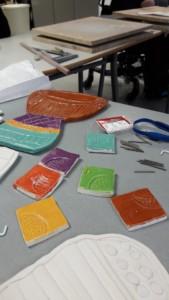 Joukko nuoria seisoo kahdessa rivissä, viidellä on kädessään tekemänsä grafiikan työ, lopuilla on malli suunnitteilla olevasta reliefistä.