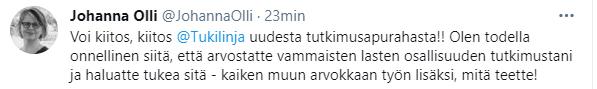 Vammaisten lasten hoitokäytäntöjen tutkija Johanna Olli kiitteli maaliskuussa Twitterin kautta Tukilinjalta saamastaan vammaistutkimusapurahasta. Apurahan päätösteksti on seuraava: