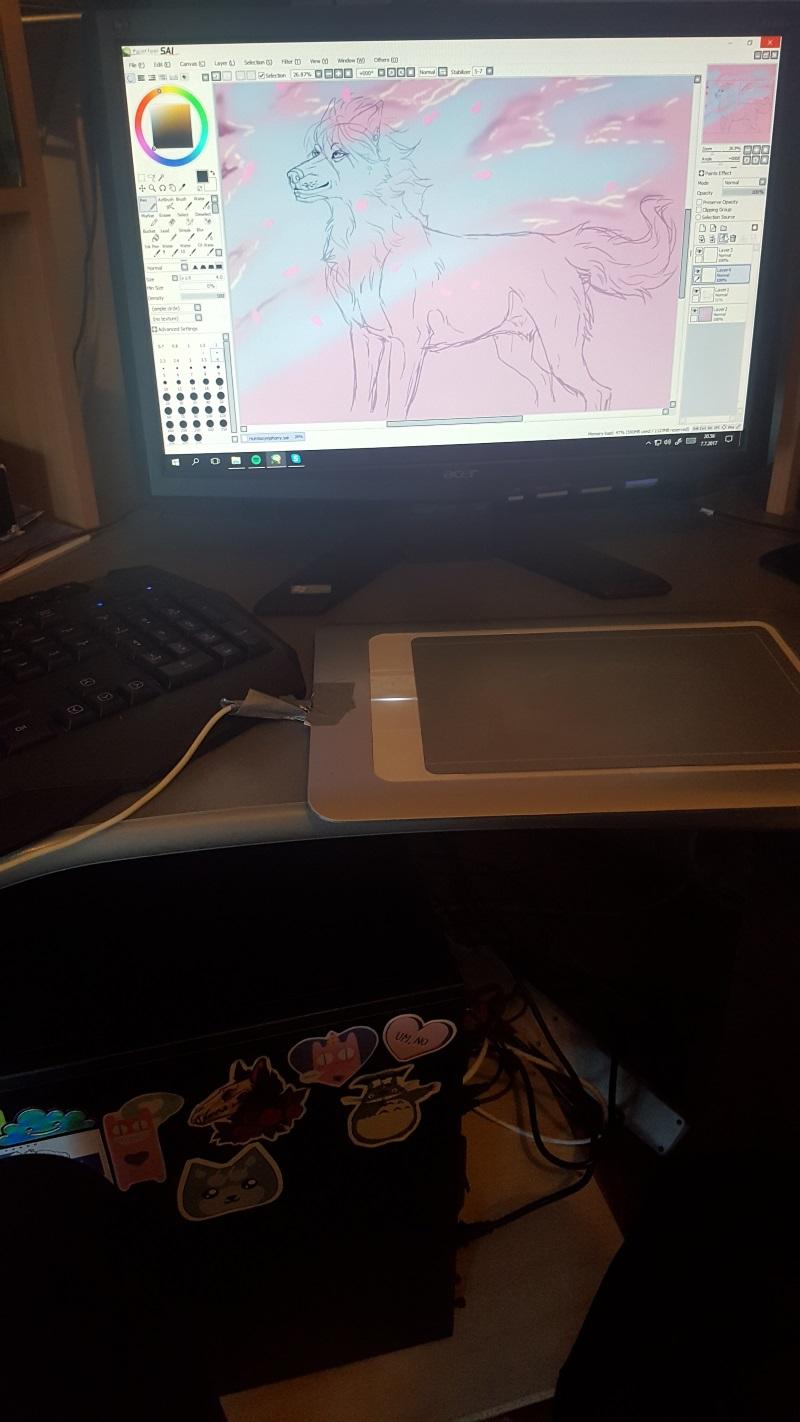 Kiitos tuhannesti saamastani rahoituksesta uuteen tietokoneeseen! Kone saapui tänään ja pääsin pitkästä aikaa taas rakkaan harrastukseni pariin eli piirtämään! Aloin heti luonnostelemaan piirrosta. Koristelin myös koneen kylkeä tarroin (alakulmassa).