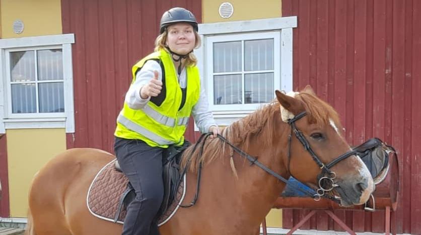 Kiitoksia Tukilinja, että mahdollistitte tämän minulle rakkaan harrastuksen onnistumisen. Kuvassa minä Tiina ja Turkan Ratsurinteen yksi tuntihevosista Veikko. Olemme menossa juuri maastoon tuntia pitämään muiden ryhmäläisten kanssa.