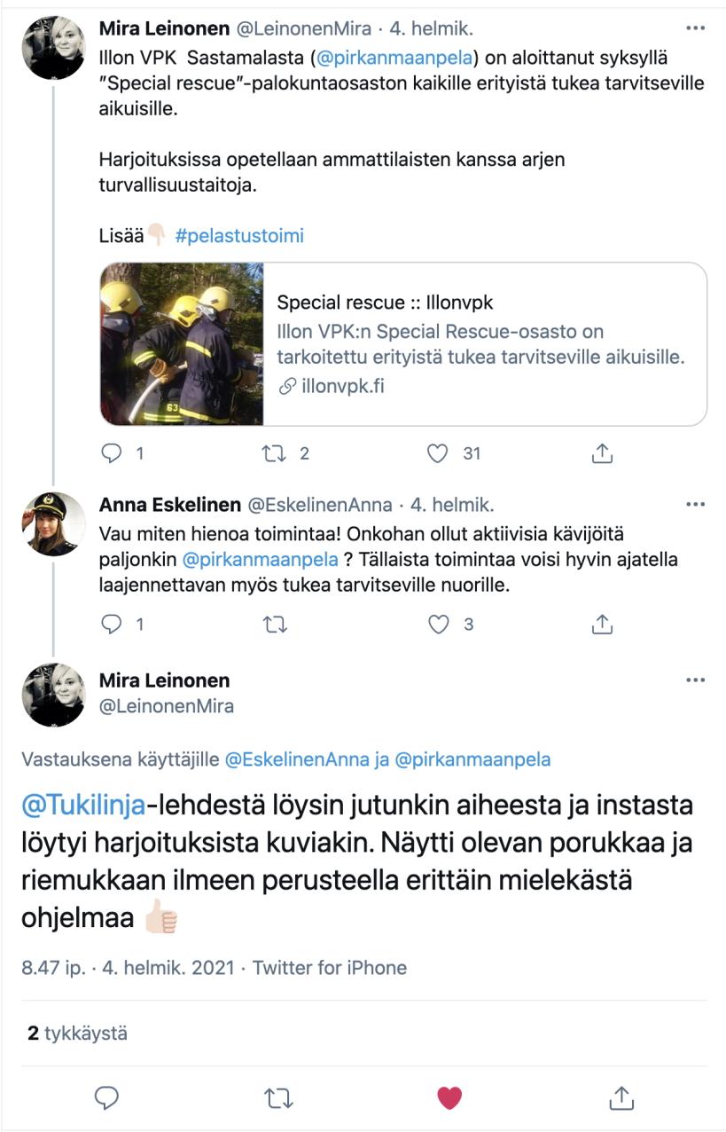 Twitterissä keskusteltiin helmikuussa Tukilinja-lehdessä 5/2020 julkaistusta artikkelista apurahan saaneesta erityis-vapaapalokuntatoiminnasta eli Special Rescue -tiimistä.