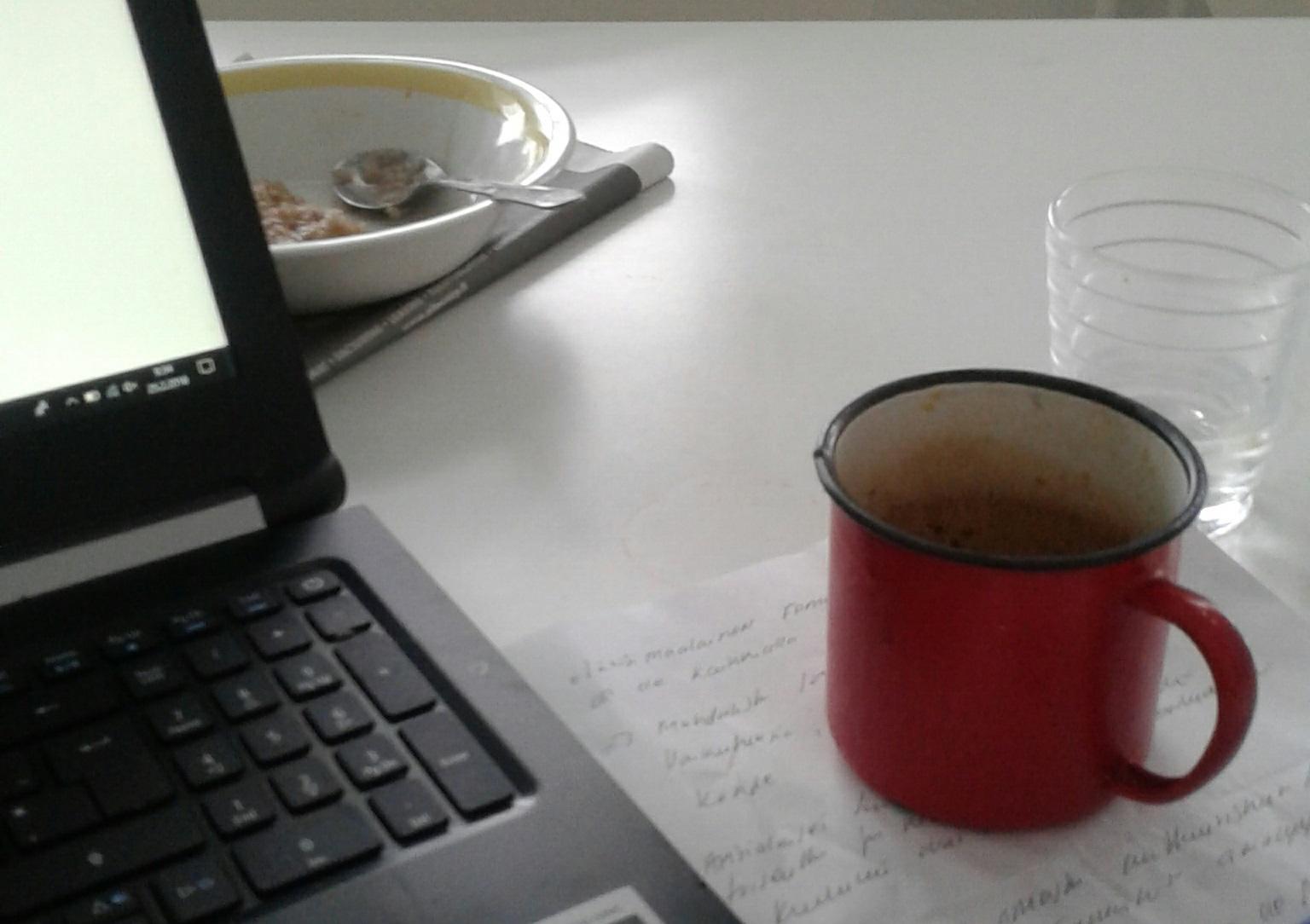 Kiitos. Ilman apurahaa minulla ei olisi konetta ja en voisi suorittaa kaikkia kurssejani!! Tää kone on ollut ihana!! Kuva on otettu kun kuuntelen luentoa ja syön aamupalaa onnellisena 🙂