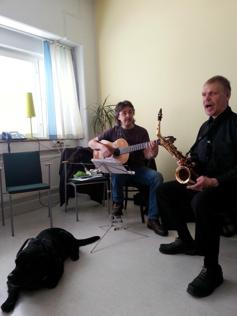 Kuvateksti: Musisoimassa Pekka Nylund, Seppo Luusalo ja Ärri -koira